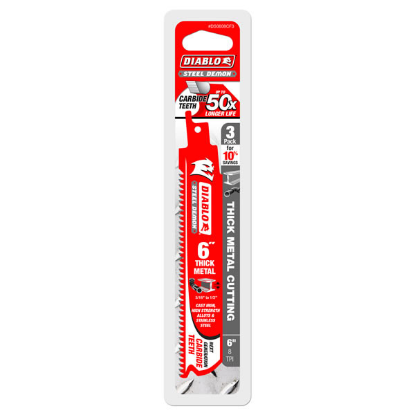 The Diablo Steel Demon Carbide-tipped reciprocating blades are the first carbide-tipped blades designed for extreme metal cutting; including high strength alloys, cast iron, and stainless steel. This high performance carbide-tipped blade delivers unmatched 50 times longer cutting life than standard bi-metal blades in extreme thick metal cutting applications between 3/16” to 1/2”.