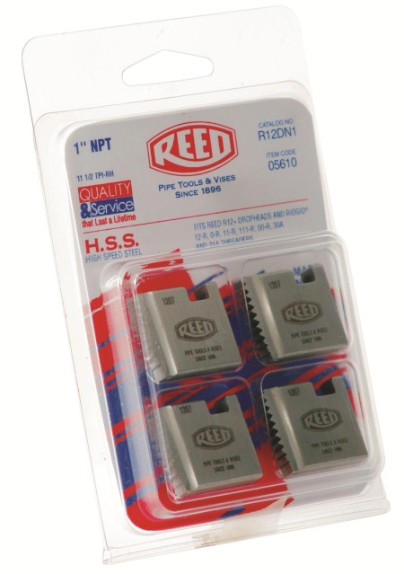 Loading... Please wait...Reed knows how to cut a good thread and high speed steel (HSS) R12+ Segmental Dies show this with cutting edges manufactured in-house by precision CNC machinery. The 1/2” through 2” die segments are available in NPT, NPSM, NPT for PVC, and BSPT. The segmental die design enables smooth chip flow and easy cutting. R12+ die sets are replaceable parts for Reed R12+ Dropheads, as well as the following Ridgid® dropheads: 12-R, 00-R, 111-R, 0-R, 11-R, 30A and 31A threaders. Segmental dies are sold in full sets of four.